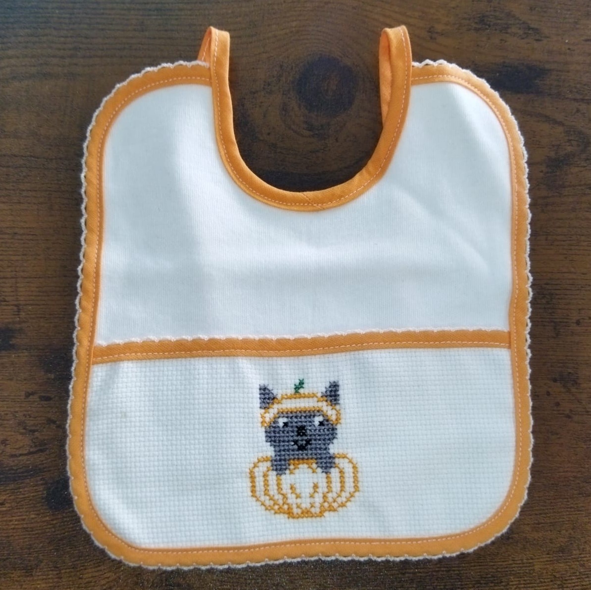 Babete "abóbora" 7,00 € Desconto de %. Partilhar Comprar Contactar 1 unidades em stock Babete personalizada com abóbora e cãozinho em ponto cruz, pronta para entrega. Para outras opções entre em contacto connosco pelos meios disponíveis.