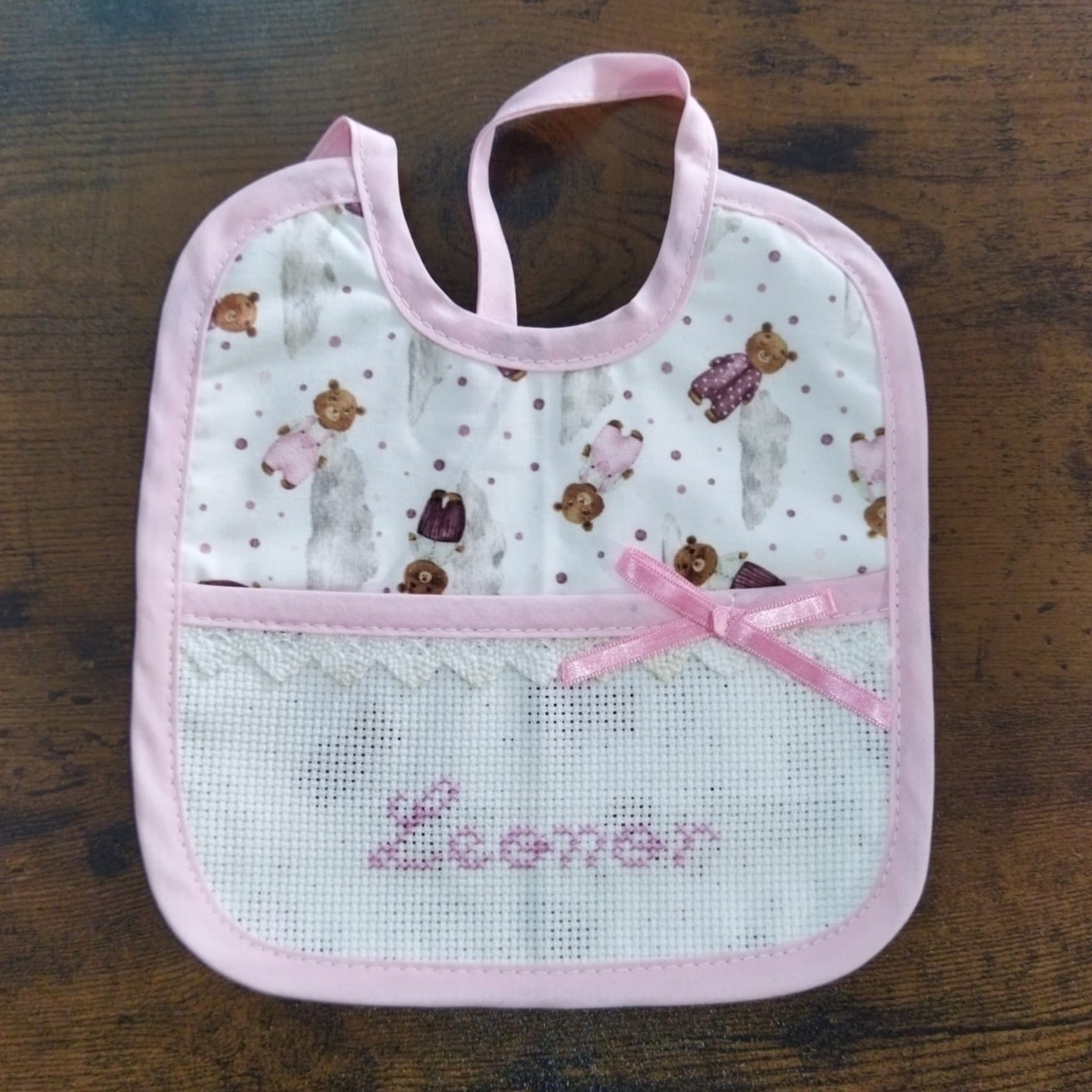 Babete "Leonor" 7,00 € Desconto de %. Partilhar Comprar Contactar 1 unidades em stock Babete personalizada com "Leonor" em ponto cruz, pronta para entrega. Para outras opções entre em contacto connosco pelos meios disponíveis.