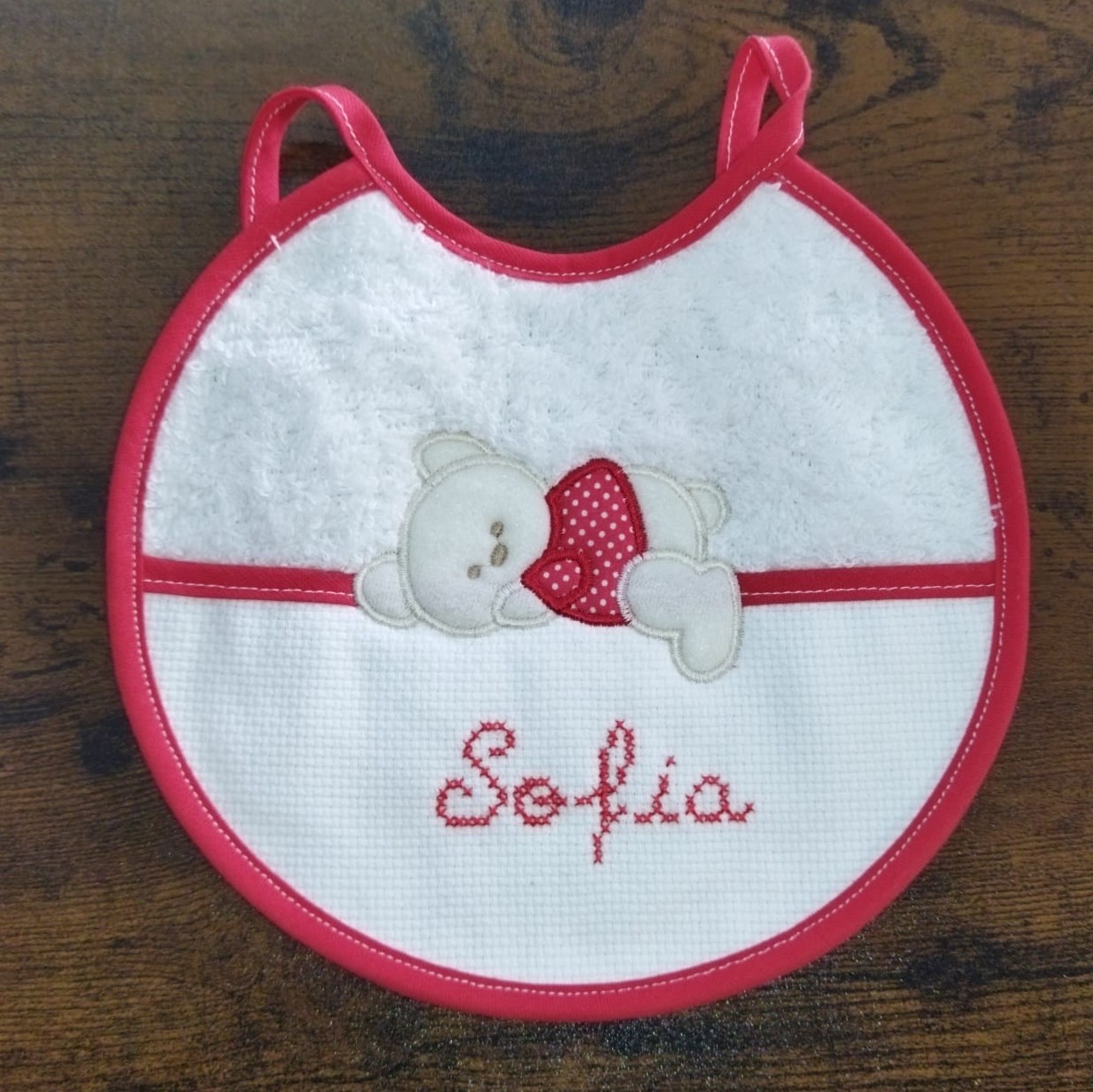 Babete "Sofia" 7,00 € Desconto de %. Partilhar Comprar Contactar 1 unidades em stock Babete personalizada com "Sofia" em ponto cruz, pronta para entrega. Para outras opções entre em contacto connosco pelos meios disponíveis.