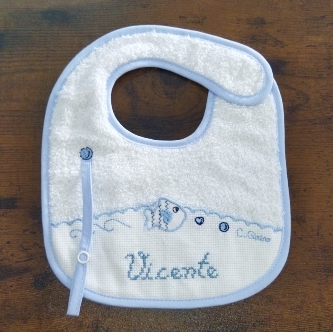 Babete "Vicente" 7,00 € Desconto de %. Partilhar Comprar Contactar 1 unidades em stock Babete personalizada com "Vicente" em ponto cruz, pronta para entrega. Para outras opções entre em contacto connosco pelos meios disponíveis.