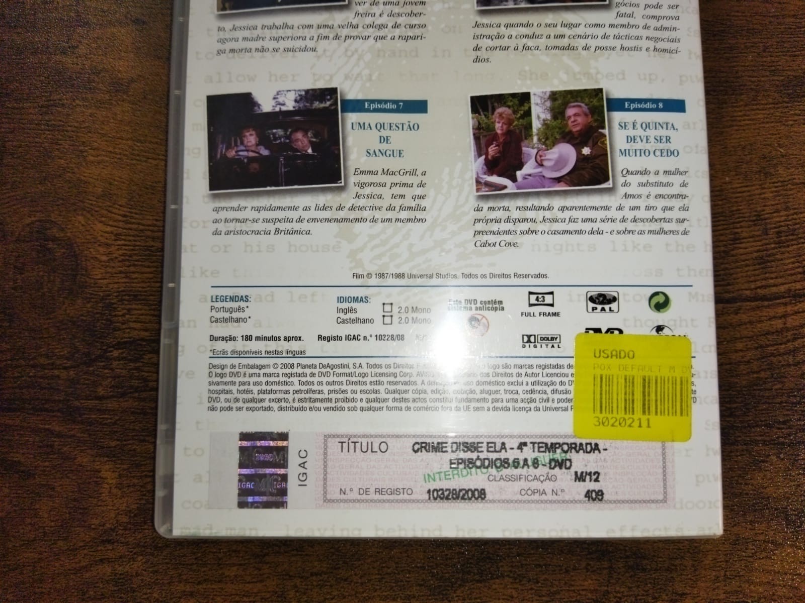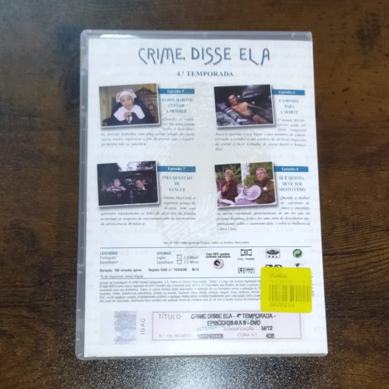 • Capa traseira de DVD da série 'Crime, Disse Ela' 4.ª temporada com texto em português e etiqueta amarela 'USADO'