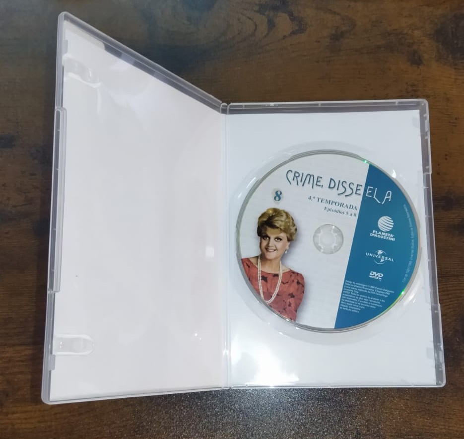 • DVD da série Crime, Disse Ela na caixa aberta sobre uma mesa de madeira.
