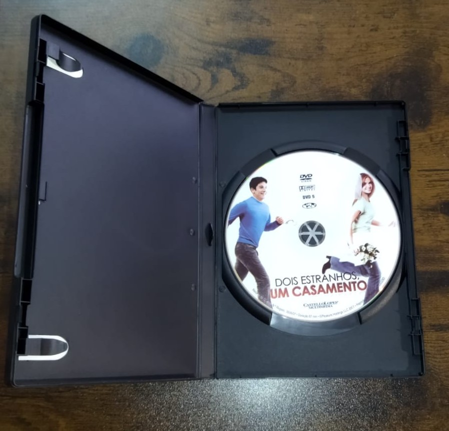 • DVD 'DOIS ESTRANHOS, UM CASAMENTO' num estojo preto aberto numa mesa de madeira