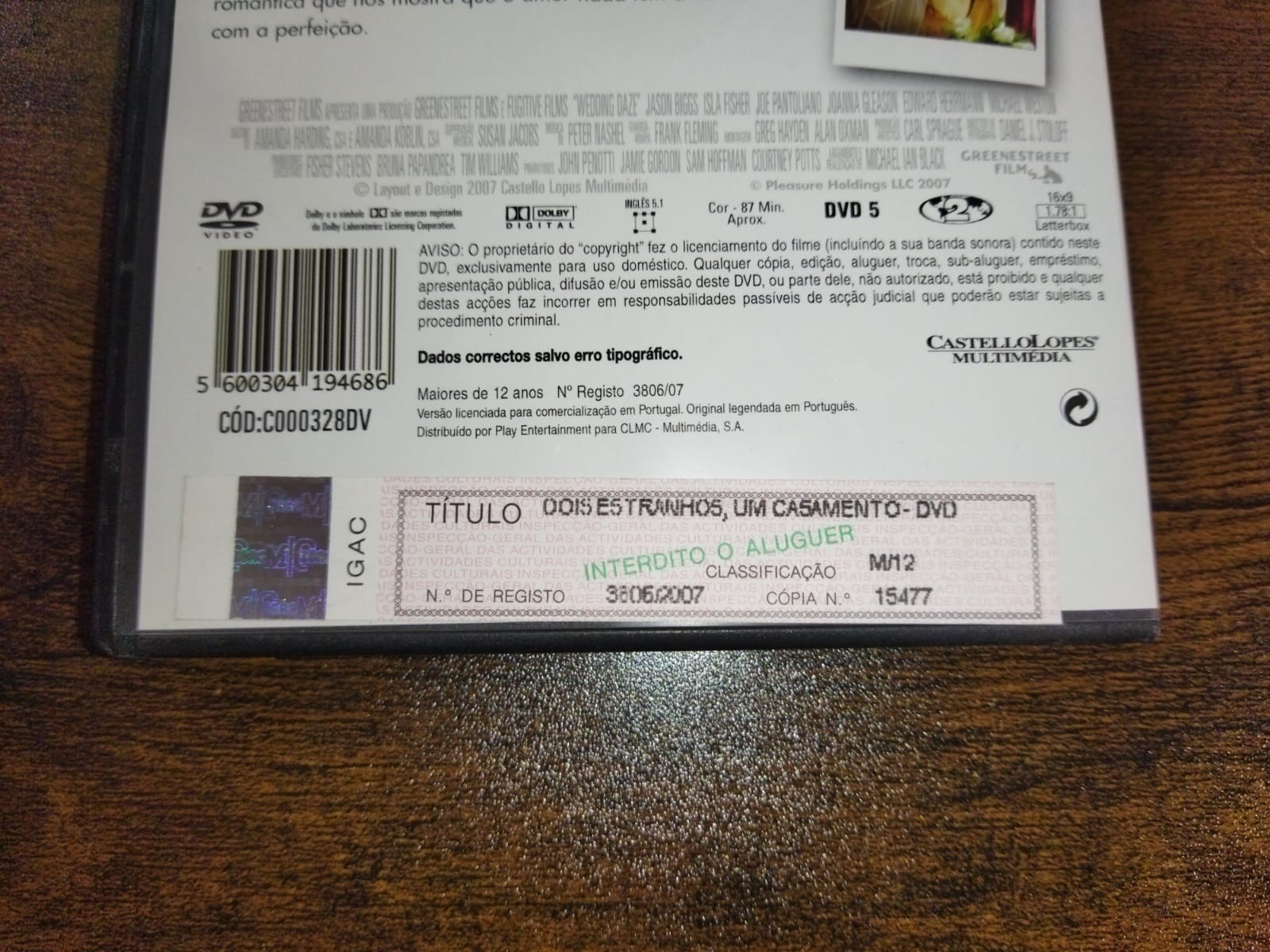 • Parte traseira de caixa de DVD com texto, códigos e selo oficial