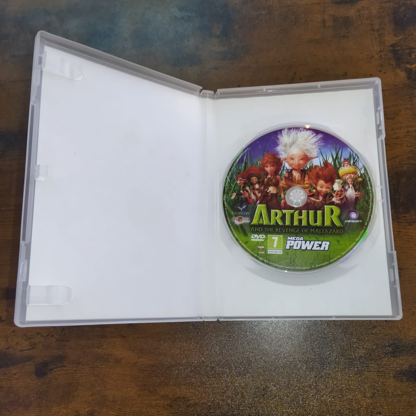 • Estojo branco aberto com disco de filme ou jogo de animação chamado ARTHUR AND THE REVENGE OF MALTAZARD.