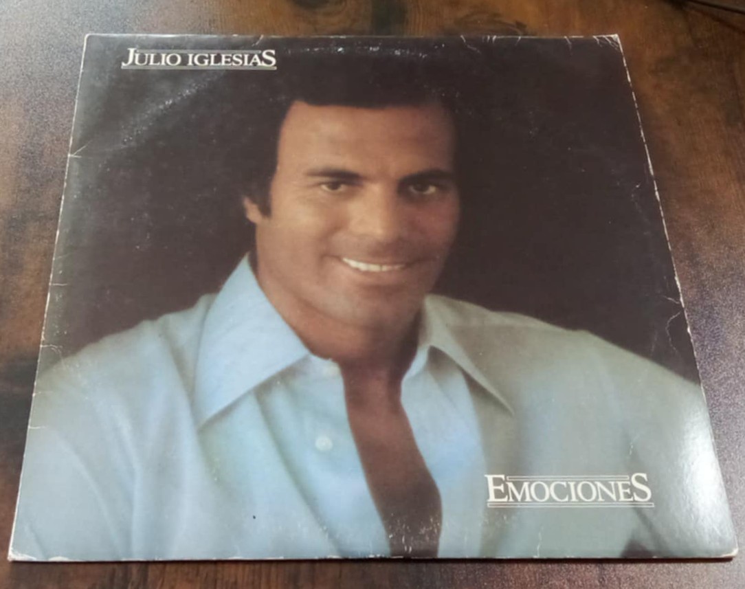 • Capa de vinil Julio Iglesias com camisa azul e fundo escuro
